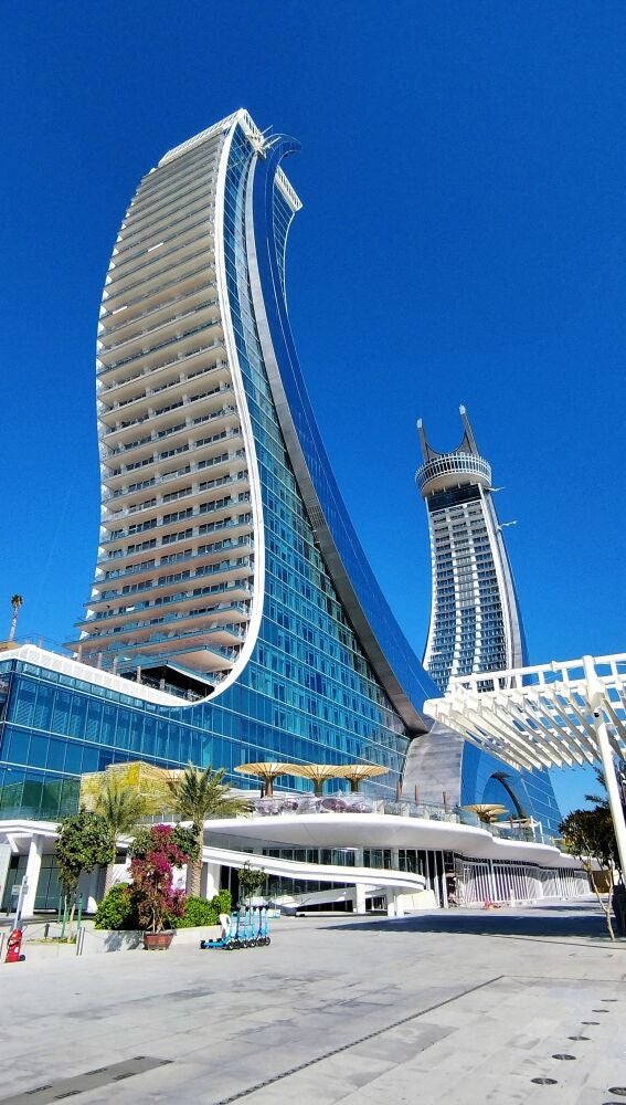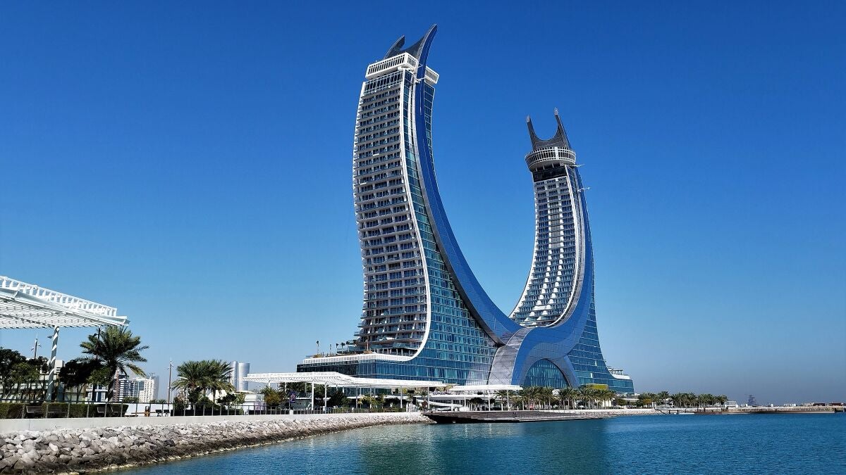 Ubicado en una isla artificial ganada al mar, en la moderna localidad de Lusail, a pocos kilómetros del centro de Doha, este hito arquitectónico posee una inconfundible silueta con dos torres simétricas curvadas de 211 metros de altura.
